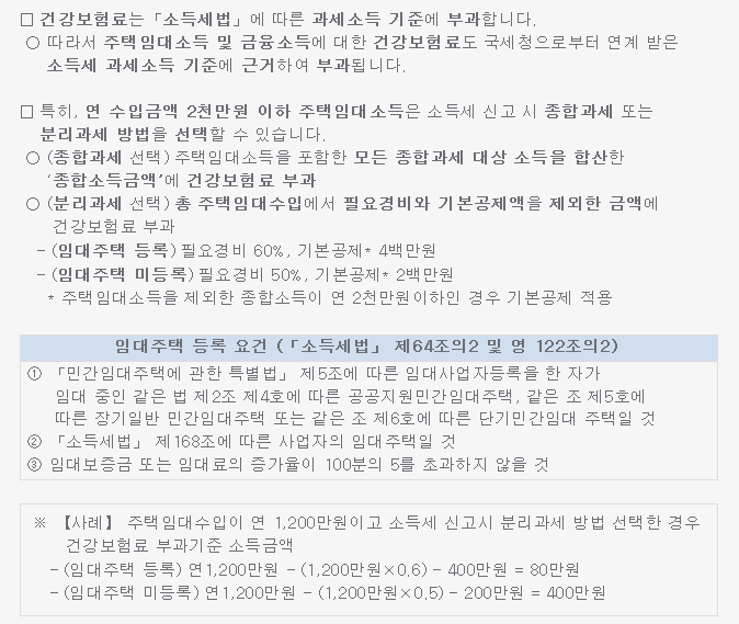 ※ 2020년 11월부터 연수입 2천만 원 이하 주택 임대, 금융소득에 건강보험료 부과