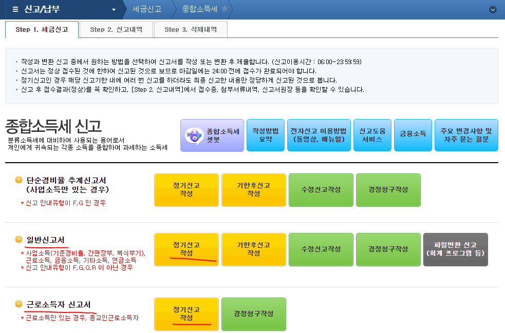 2. 근로소득 외 종합소득이 같이 있는 경우, [일반 신고서> 정기신고 작성]를 통해 신고하시면 됩니다.