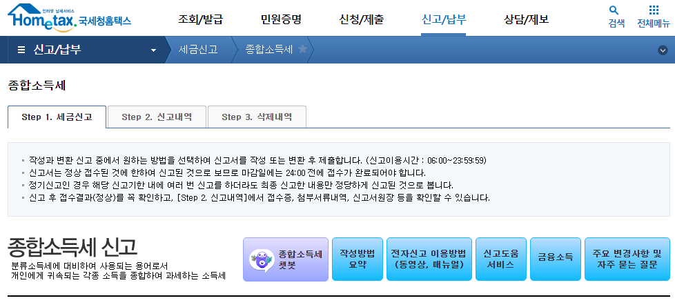 [홈택스> 신고/납부> 세금신고> 종합소득세> 근로소득자 신고서> 정기신고 작성]에서 신고 진행,